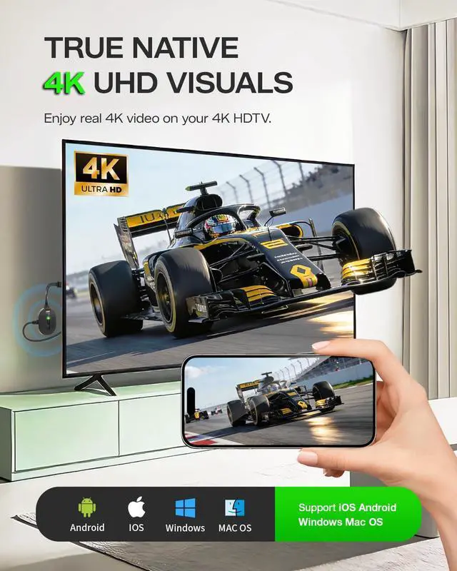 True 4K Input & OutputAIMIBO wireless display adapter delivers genuine 4K input and outputnot just 1080p upscaling or limited 4K decoding. Experience end-to-end native 4K resolution that preserves vivid colors, sharp details, and crystal-clear imagery. Perfect for presenting high-resolution designs, s*treaming 4K HDR movies, or playing graphics-intensive gamesevery pixel is rendered with stunning accuracy for a truly immersive viewing experience.