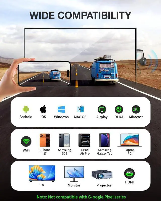 Wide Device CompatibilityOur Miracast adapter works seamlessly with i-Phone 17 and earlier models, i-Pad, MacBook, Windows PCs, and Android phones, wirelessly mirroring your screen to TVs, monitors, or projectors. This upgraded HDMI dongle supports direct mirroring with i-Phone 17no online updates required. Ideal for meetings, movie nights, classrooms, or presentations, it ensures stable, hassle-free screen sharing across all your devices.