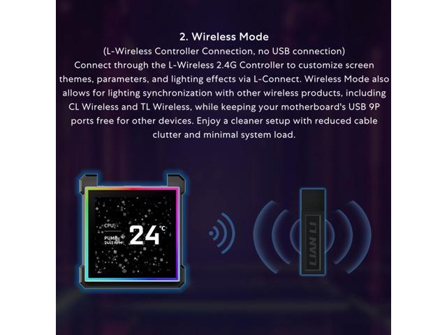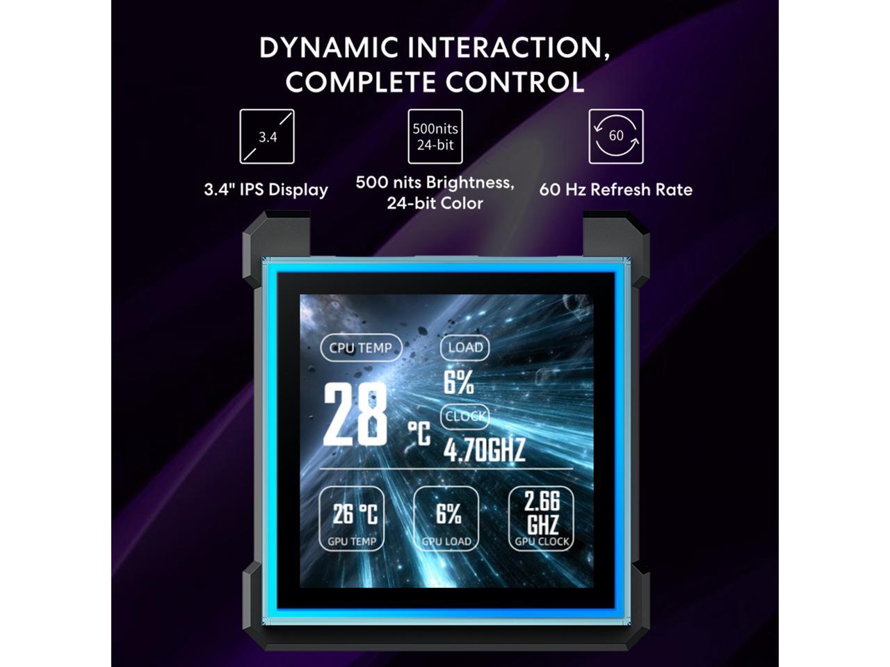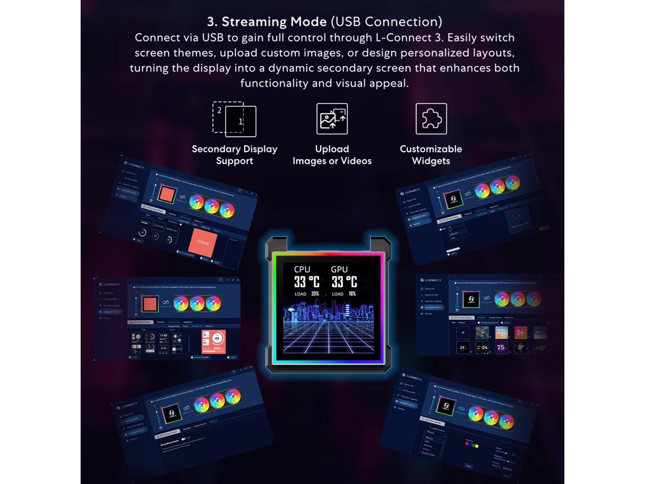 - 3.4" IPS LCD with 2 Control Modes: Featuring a 3.4" IPS LCD with 480×480 resolution, 500 nits brightness, and 60Hz refresh rate for stunning visuals, users can choose between Wireless Mode for remote control of themes and lighting effects, or switch to Advanced USB-connected Mode for comprehensive customization through L-Connect 3 software via USB.