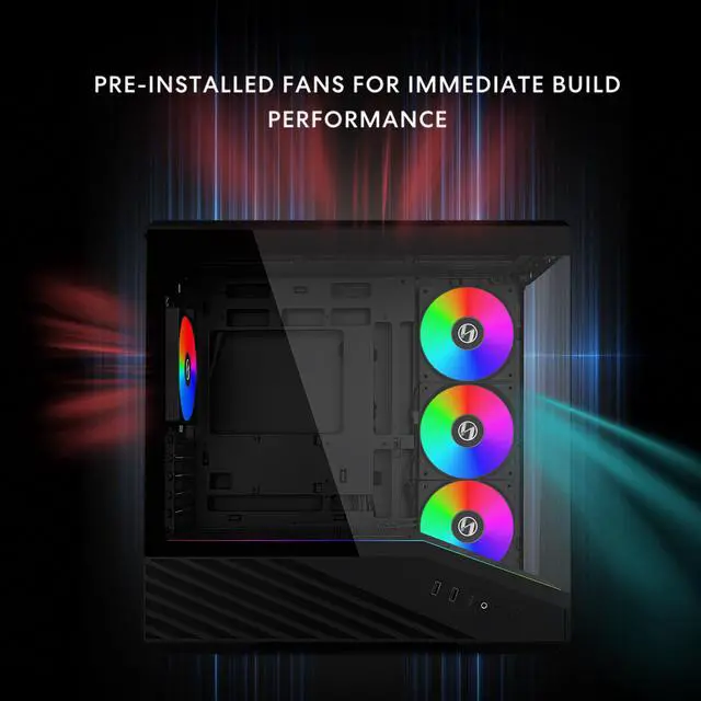 The VECTOR V100 MINI is the compact mATX version of the Vector V100, made for builders who want performance and style in a smaller footprint. Featuring front and side tempered glass panels for 270° unobstructed visibility, the case showcases components clearly while an integrated ARGB strip adds personalized lighting. Despite its size, it supports three 120mm side fans for effective cooling. The V100 MINI comes in the V100R MINI variant with four pre-installed 120mm ARGB fans, three with reverse airflow at the side and one standard at the rear. The V100 MINI supports various types of GPU with an included anti-sag bracket.