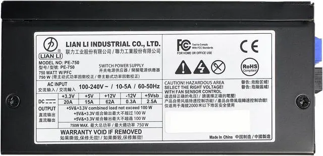 The LIAN LI PE-750 power supply delivers high power efficiency of at least 89% (92% max). It is certified for 80 Plus Platinum standards. It allows you to make the most of every watt.
