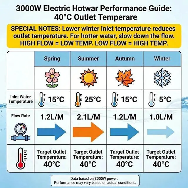 The temperature depends on the water flow rate. In winter (inlet water ~5°C), you must reduce the water flow to get warm water.