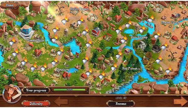 | Feature | Ted used to be a simple farmer. But he just couldn't see himself being a farmer his whole life. He wanted more. So Ted decided to leave for the big city and finish school there. Once he was done with his education, he decided it's finally time to find a job somewhere. And he found one in a small town called Sunset Hills. He got a job as an assistant in the mayor's office. This is how Ted and Catherine met! Even though he tried to hide it, he was smitten the first time he laid eyes on her. Unfortunately for Ted, the mayor himself was Catherine's fiancé. And the mayor... well, the mayor had some very ambitious plans for Sunset Hills. Or better said, some very ambitious plans for himself... 40 exciting levels to master Hundreds of Quests 3 game modes (relaxed, timed and extreme) Explore the Wild West and meet peculiar characters Help Ted and his friends in their adventures |
