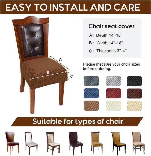 Seat covers for dining room chairs with good stretchet material to fits well and serves its purpose superbly to protect and help prevent the cloth dining chairs from the kids food, cat's scratching or other pets stains. Dining room chair seat cover with high quality stretchy Fabric made by 85% Polyester and 15% Spandex. Soft,Comfortable,Breathable,Skin-friendly,wrinkle-resistant,anti-pilling. Chair seat covers suitable for the chairs sizes: Chair seat width and length 14-19" and thickness 2-4". One minute makes dining room chairs easy to change the color of your decor with true color and stays put. Great cover, perfect color, durable, soft and good fit. Easy to use and clean. Perfect quick fix. Renewed look. Fit most of kitchen chairs ,parsons chairs, bar chairs. Material sturdy with no real concerns on washing. Please hand wash or machine wash with cold water under 30 degree.