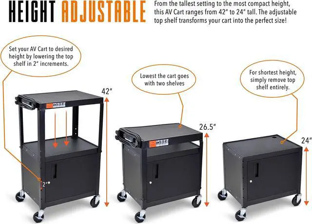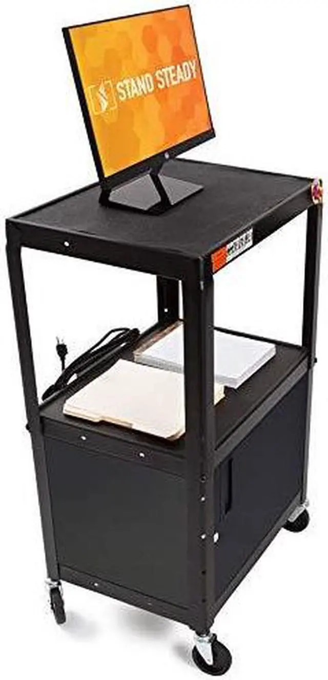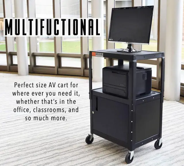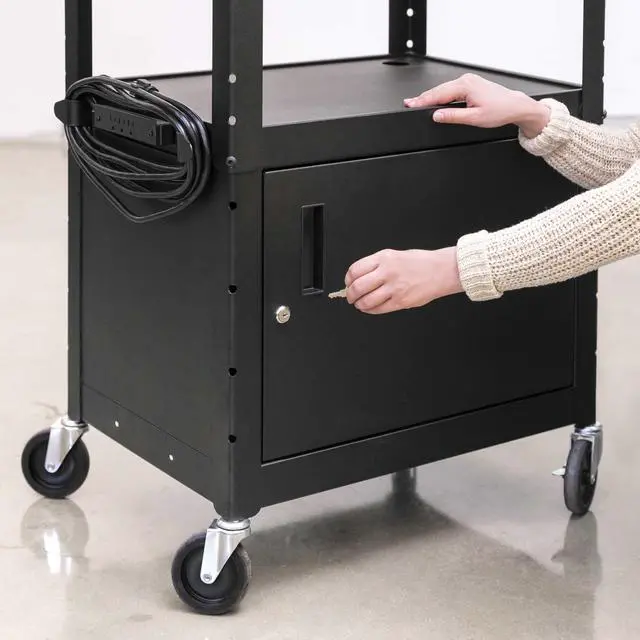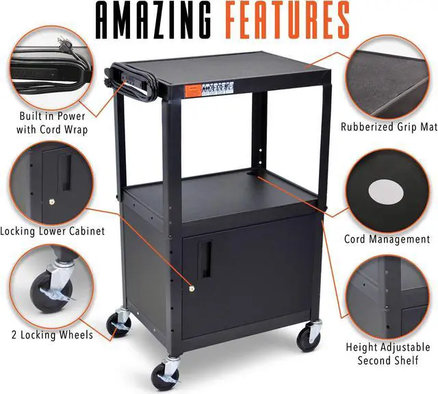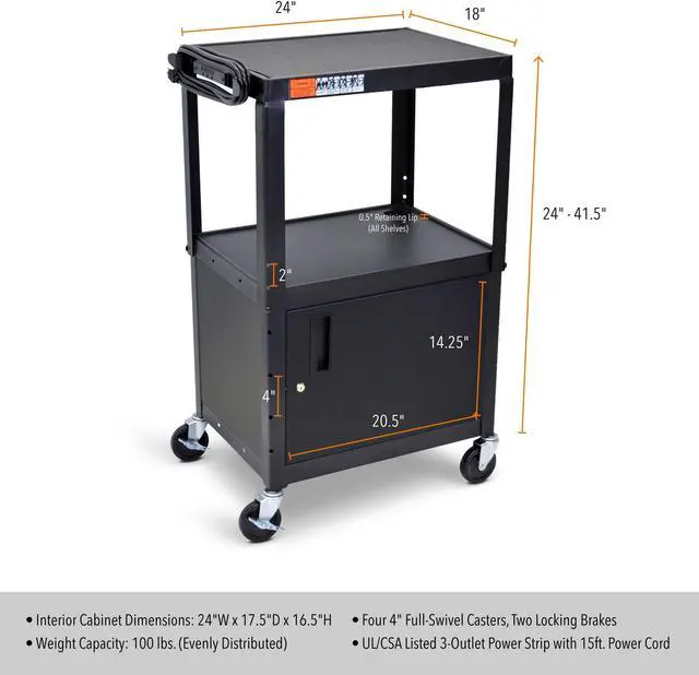 Features We Love: Two grommet holes for easy cord management, 4" silent roll, full swivel wheels with 2 locking brakes, UL/CSA listed, 3-outlet power strip, Safety mat for non-slip storage, Three prong plug, Locking