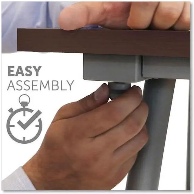 Stylish minimalist design for universal appeal. Scratch- and stain-resistant woodgrain laminate with durable edge. Fully assembled. Strong powder coated steel frame. Adjustable leveling glides for stability.