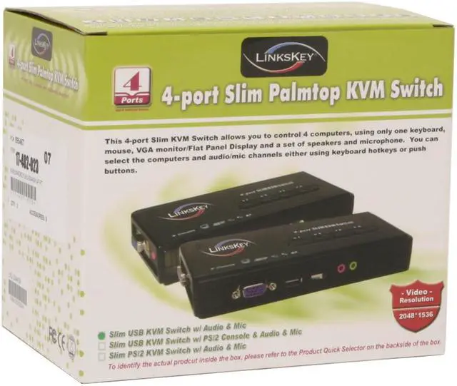 Control Four PCsShare one monitor, keyboard, mouse and audio devices between four USB-compatible computers using the LINKSKEY LKU-S04ASK palmtop KVM switch. The built-in VGA connector supports monitors with resolutions of up to 2048 x 1536.