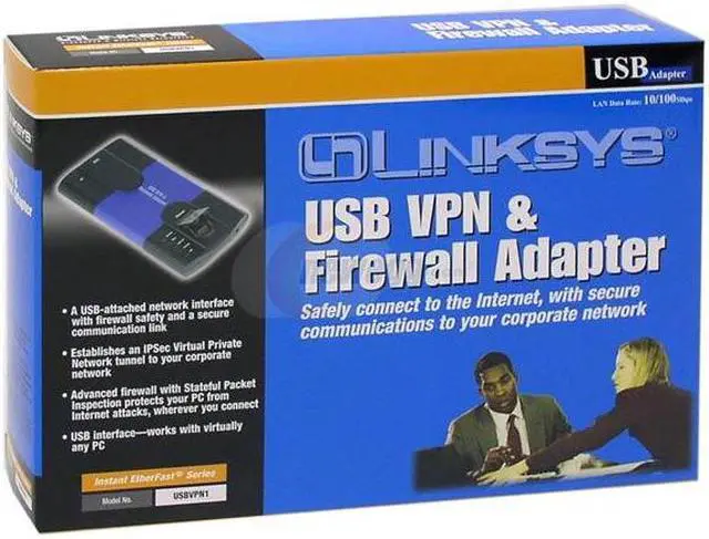 Let the Linksys USB VPN and Firewall Adapter protect your PC and your communications wherever you go. This easy-to-pack, lightweight, network interface with advanced safety and security features connects you to the Internet through any broadband connection (cable, DSL, or your hotel's fast Internet service), and protects your PC from most known Internet attacks with a powerful Stateful Packet Inspection firewall. You can also optionally block Java, Active X, and Cookies -- known points of entry for hackers.