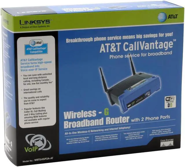 The Wireless-G WRT54GP2A-AT Broadband Router with 2 Phone Ports can share a high-speed Internet connection, files, printers, and multi-player games, and turn that Internet connection into a high-quality, high-value AT&T voice service.