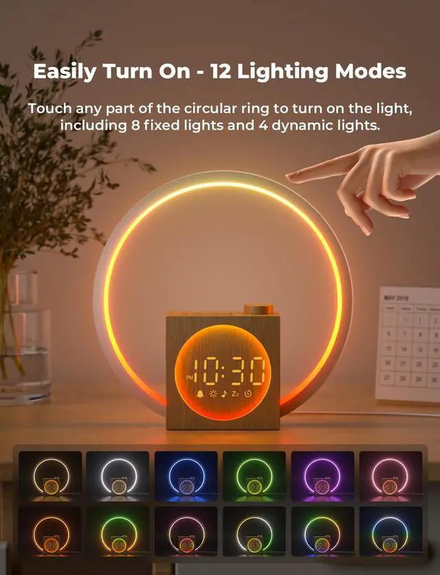 In addition to the sunrise simulation, this ring night light features 12 modes: fixed color, gradient, breathing light, circular gradient, and chasing lights.