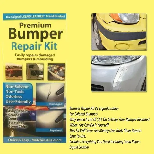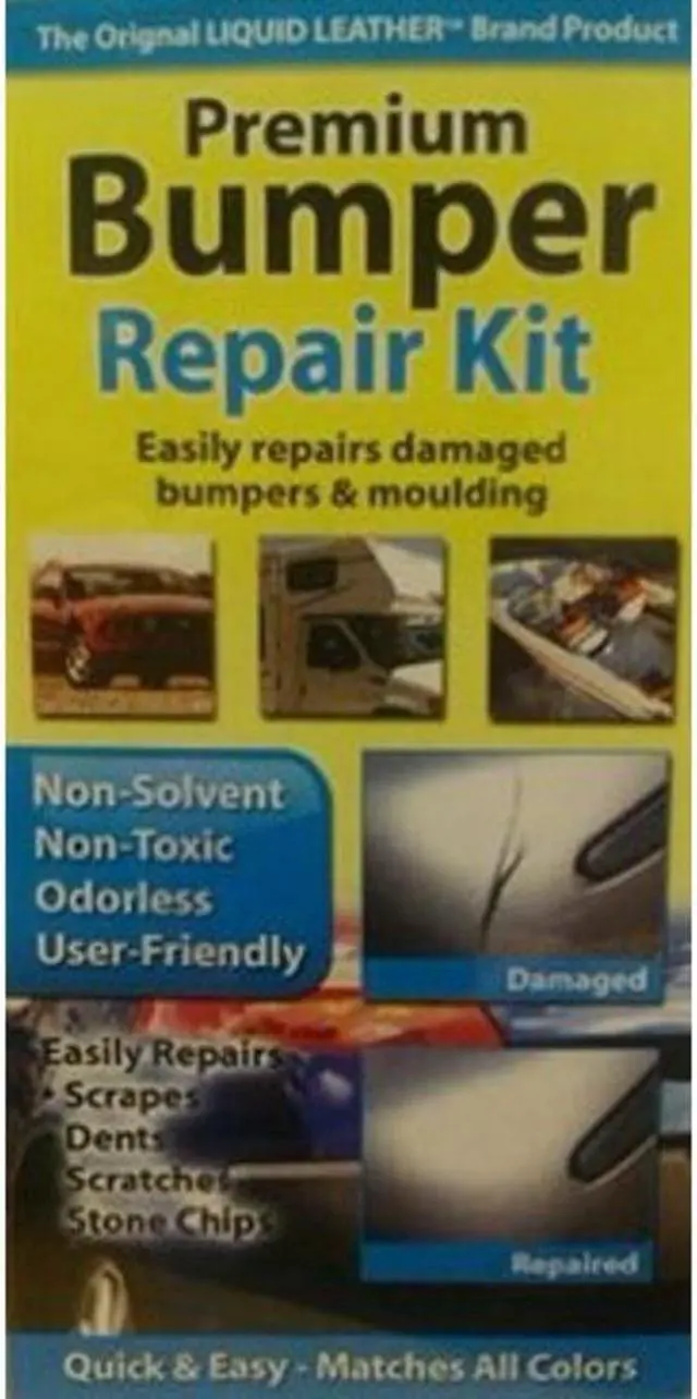 Liquid Leather Car Bumper Repair Kit Compound 20 902B Liquid Leather Bumper Repair Kit 20 902B This kit comes with a black bumper repair compound and bumper finish compound. If your bumper is colored repair then get bumper matching paint from your dealer for a near perfect matched repair job. If it is black then this kit has everything you need. Kit Includes Epoxy Ribbon clay-like material Bumper Repair Compound Bumper Liquid Finisher Nail brush applicator Spatula Sandpaper Grain paper pack Instruction sheet. 0.31 lb Black