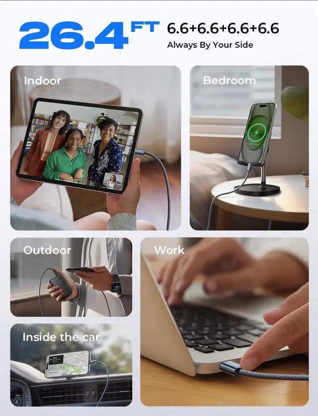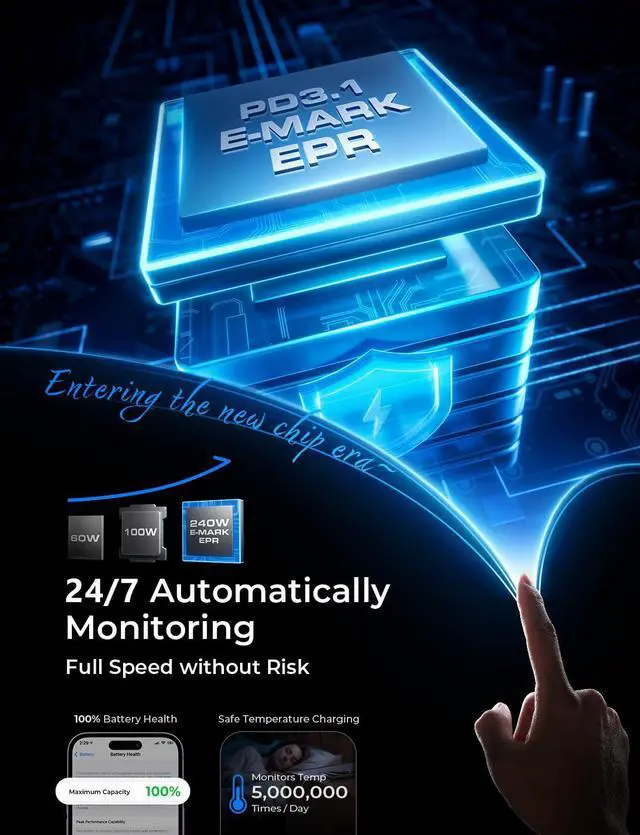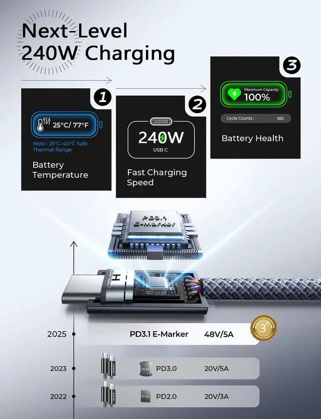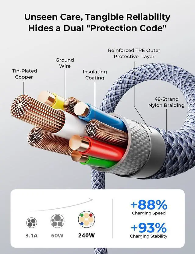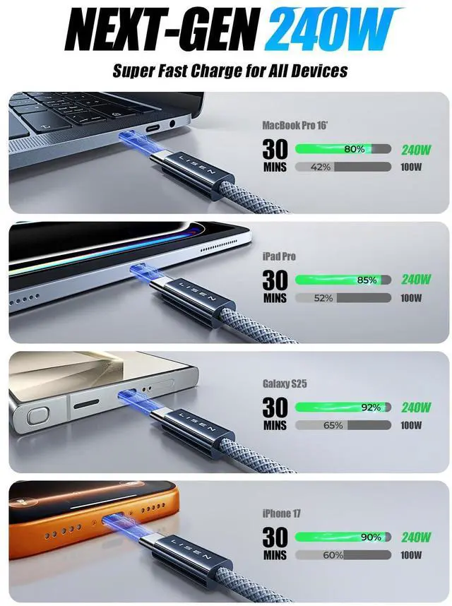 Next-Gen Hyper-Speed Charging: 240W Full Power Performance: Say goodbye to waiting! Our apple USB-C to USB-C charging cable supports up to 240W Max (48V/5A) power output, fully compatible with the latest USB PD 3.1 protocol, while remaining backward compatible with mainstream fast-charging standards like PD3.0/QC4.0. Efficiency Boost: Up to 4X faster compared to traditional 60W cables, truly enabling instant plug-and-charge for non-stop, high-efficiency work