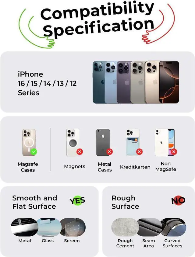 | Compatible Phone Model | iPhone 16, 16 Pro, 16 Pro Max, 16 Plus, iPhone 15, 15 Pro, 15 Pro Max, 15 Plus, iPhone 14, 14 Pro, 14 Pro Max, 14 Plus, iPhone 13, 13 Pro, 13 Pro Max, 13 Mini, iPhone 12, 12 Pro, 12 Pro Max, 12 Mini; iPhone mit MagSafe-Hüllen; Samsung Galaxy S22/ S22+/ S22 Ultra/ S21 5G/ S21+ 5G/ S21 Ultra 5G/ Note20/ S20/ S20+/ S20 Ultra 5G/ Note10/ Note10+/ S10/ S10+/ S10e/ S9/ S9+/ S8/ S8+/ Note 8/ S7/ S7 Edge/ S6/ S6 Edge/ S5/ S4, Google Pixel, LG Oneplus Nokia Sony, HTC, etc. |