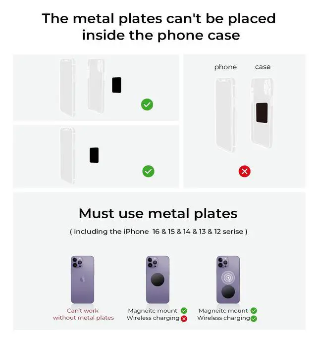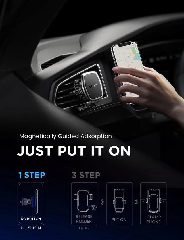LOCK YOUR PHONE STABLE: LISEN magnetic car phone holder mounts with 6 built-in strong neodymium iron boron magnets that hold up to 7.7lb / 3.5kg (15 x iPhone 13). Thanks to the strong suction power, your mobile phone or tablet will be kept in place even on bumpy roads. PLEASE NOTE: 1. The phone holder for car fits all 4-7'' iPhone, Samsung, and other cellphones with thick cases. 2. It is recommended to install the metal plate on the back of the phone or phone case.