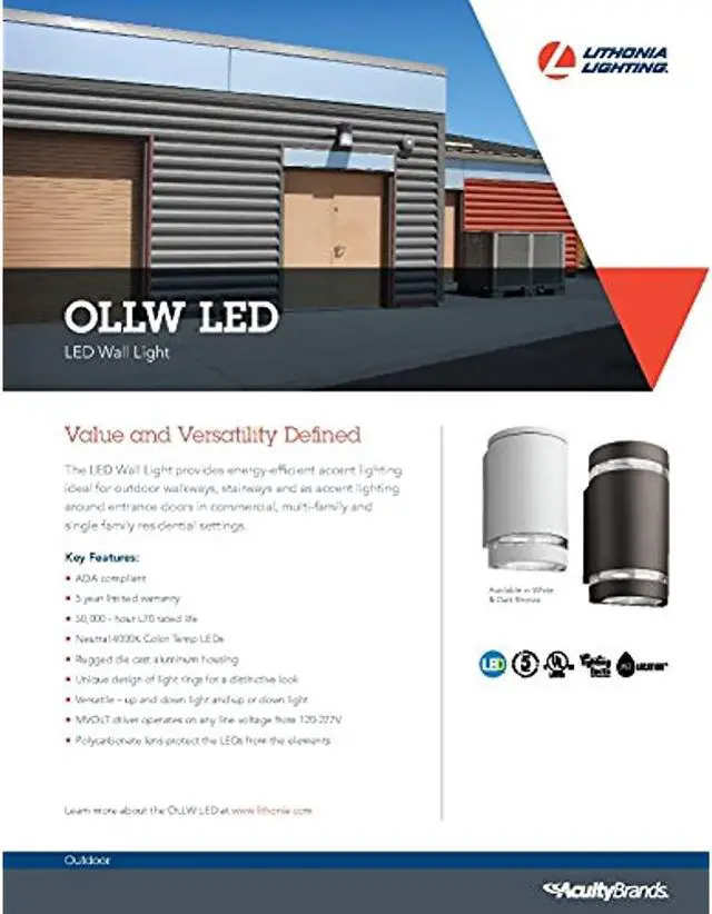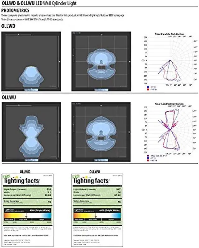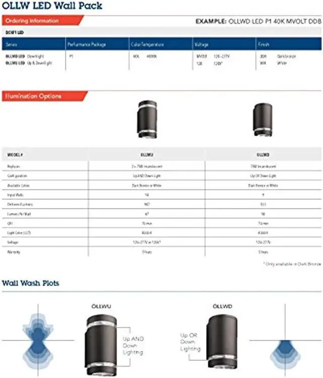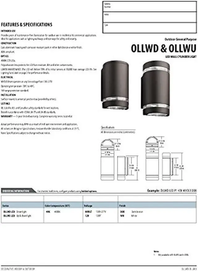 Lithonia Lighting OLLWU P1 40K Ddb M6 Led Outdoor Cylinder up and Down Light, MVOLT 4000K, 9W, Dark Bronze About this itemSave energy and reduce power consumption: this integrated LED lightening provides 940 lumens and 4000K ight white temperature for smooth light everywhere while only using 14 watts ^^ 50, 000