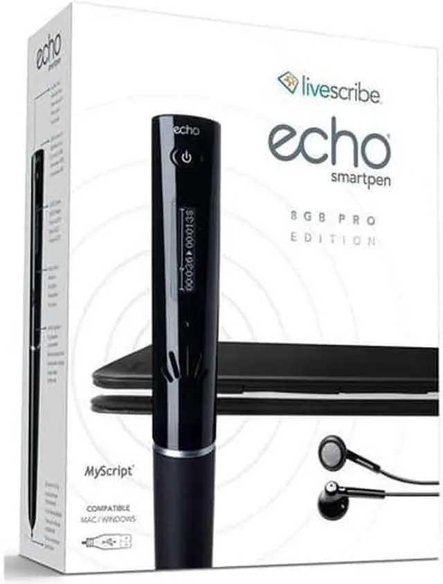 Save notes & pencasts directly to your computer •Record everything you hear, say and write, while linking your audio recordings to your notes.•Replay audio directly from paper by tapping on your notes•Echo Desktop software allows you to save, organize and play back interactive notes from your Mac or Windows computer.•Search for words within your notes.•Share notes and pencasts as images.•Send notes and audio to any destination.•Comes with Smartpen Portfolio, 3-D Recording Headset, 2 ink cartridges & 2 caps.•Includes MyScript for Livescribe, the fastest way to convert your handwritten notes into digital text