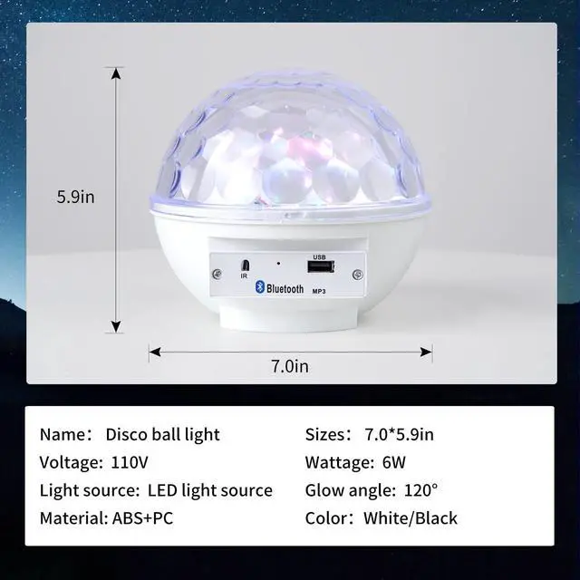 Disco Ball Lights with Remote ControlChoose the color, auto mode, sound activity mode, flashing mode, rotating mode through the remote control, freely customize your favorite lighting effects, the higher the sound frequency, the faster the light flashing and rotating speed.