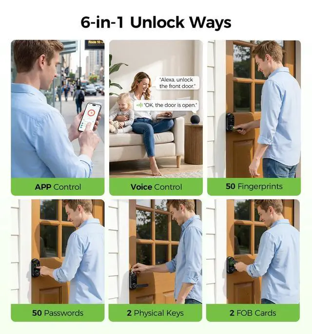 6-in-1 Keyless Entry Door Lock Enjoy ultimate convenience with 6 unlocking methods: Alexa & Google Assistant, Voice Control,Fingerprint, Passcode, App, FOB Card, and Mechanical Key. With support for up to 50 unique fingerprints and 50 custom passcodes, it is the perfect security solution for large families, rental properties, and office guests.