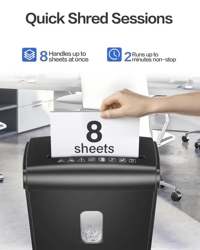 The 8-sheet micro-cut shredder runs continuously for 2 minutes before requiring a 45-minute cool-down period.