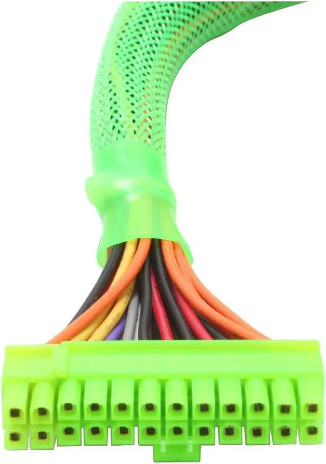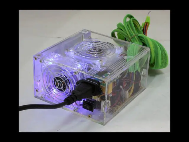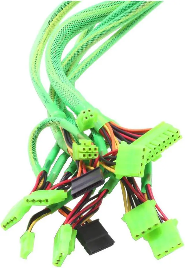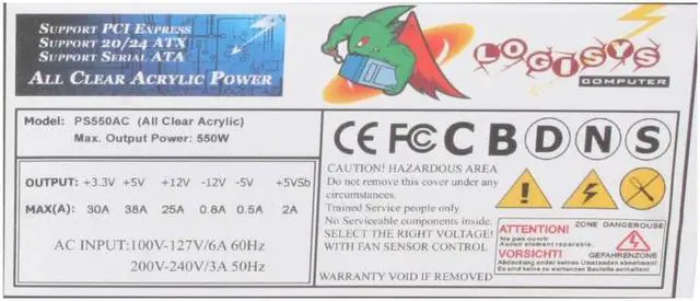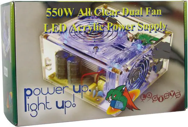 The PS550AC is a clear power supply with maximum 550W output, 20 and 24 pin ATX plug, two serial ATA connectors, 6 4pin 12v connectors, and PCI express connector. All the cables and wires have been sleeved with green UV interactive net. Plus, the cables and wires are extended to at least 19" up to 24" long in order to be compatible with almost all chassis in the market, even most of the full size tower chassis. Dual 80mm blue LED silent fans assure excellent and maximum cooling performance.