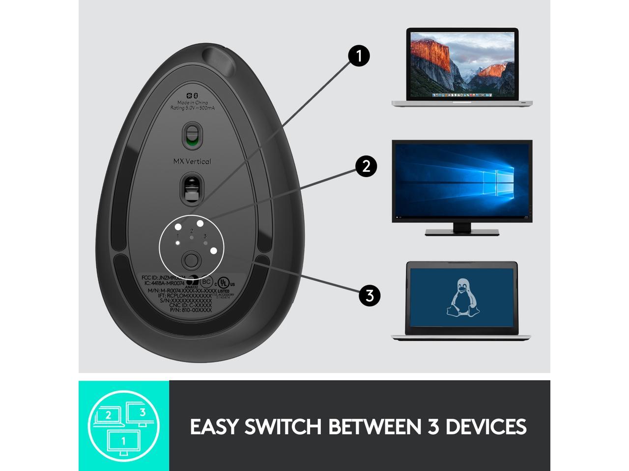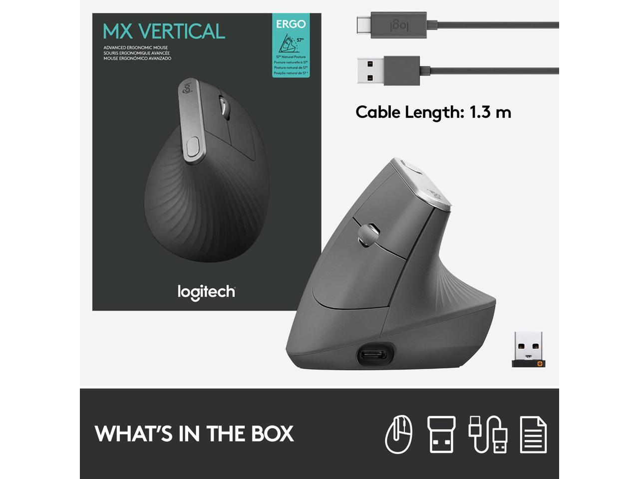 Logitech MX Vertical Wireless Mouse – Advanced Ergonomic Design Reduces Muscle Strain, Control and Move Content Between 3 Windows and Apple Computers (Bluetooth or USB), Rechargeable, Graphite
