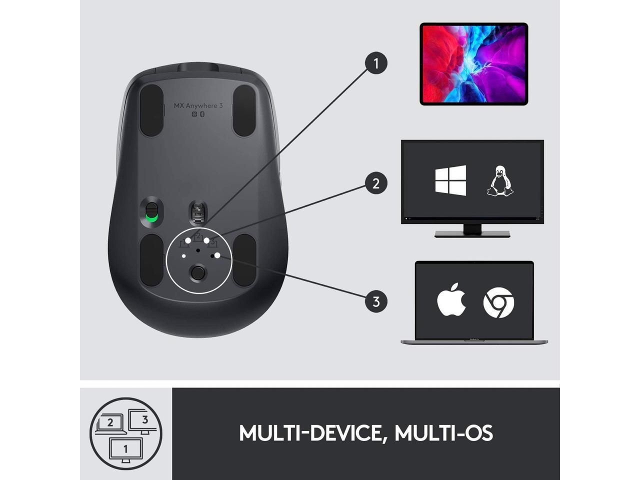 - MULTI-DEVICE, MULTI-OS - Connect up to three devices and switch between them at the tap of a button. MX Anywhere 3 works with Windows, macOS, iPadOS, ChromeOS, and Linux.