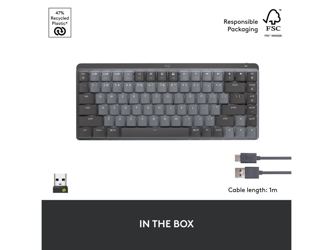 - USB-C quick charging: MX Mechanical Mini keyboard stays powered up to 15 days on a full charge or up to 10 months with the backlighting turned off