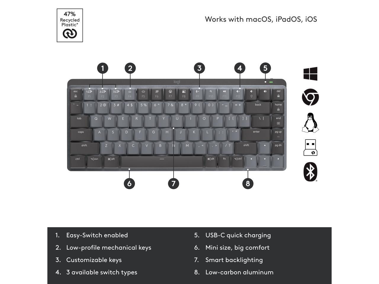 - Multi-device, multi-OS: Pair MX Mechanical Mini Bluetooth wireless keyboard with up to 3 devices on nearly any operating system via Bluetooth Low Energy or included Logi Bolt receiver(2)