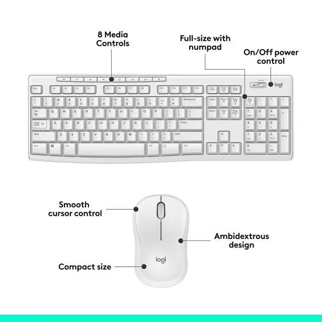FULL-SIZE KEYBOARDComfortable, full-sized, and efficient. Complete with easy access to media controls, this keyboard lets you get more done in less time with eight media controls that let you instantly access to music, media, volume, and moreCOMFORTABLE COMPACT MOUSEStay productive longer with the comfortable, contoured shape that follows the natural curve of your hand. This compact and wireless mouse is designed to be equally comfortable for both left- and right-handed users. Plus, it? s smooth cursor control allows you easy navigation on most surfaces. SIMPLY WIRELESSForget about drop-outs and lag thanks to a strong, reliable 2.4 GHz wireless connection with a 10 m range.