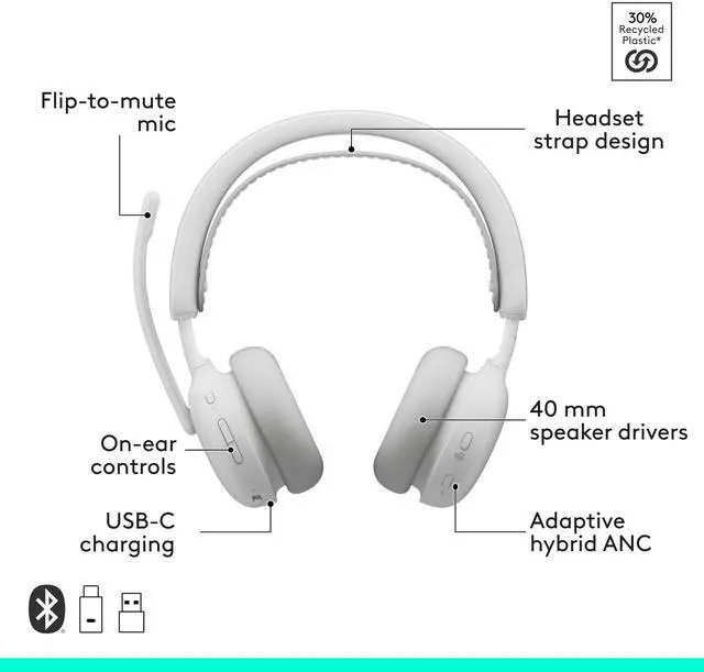 Logitech Zone Wireless 2 ES for Business - Noise-Canceling Wireless Headset with Adaptive Hybrid ANC (Teams version, with receiver) - Off-white