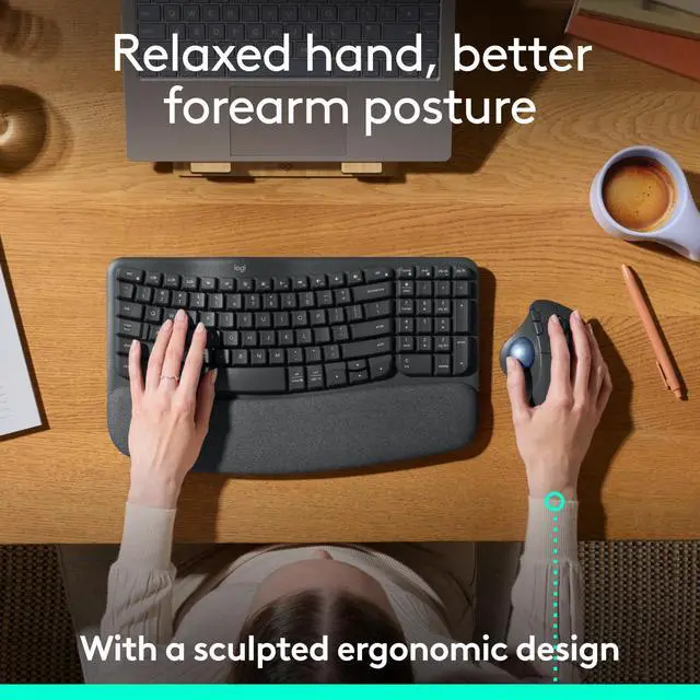 Match ERGO M575S with Wave Keys wireless ergonomic keyboard. This compact wavy keyboard is designed for familiar, natural typing and more wrist support.