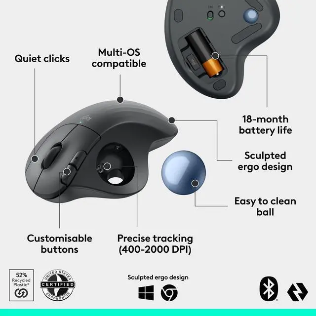 Connect ERGO M575S using Bluetooth Low Energy or included Logi Bolt USB Receiver. Enjoy quiet productivity with 80% quieter clicks and up to 18 months of battery life.