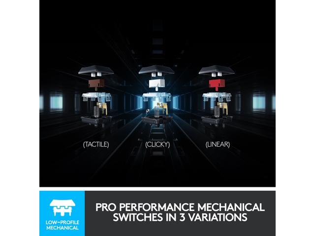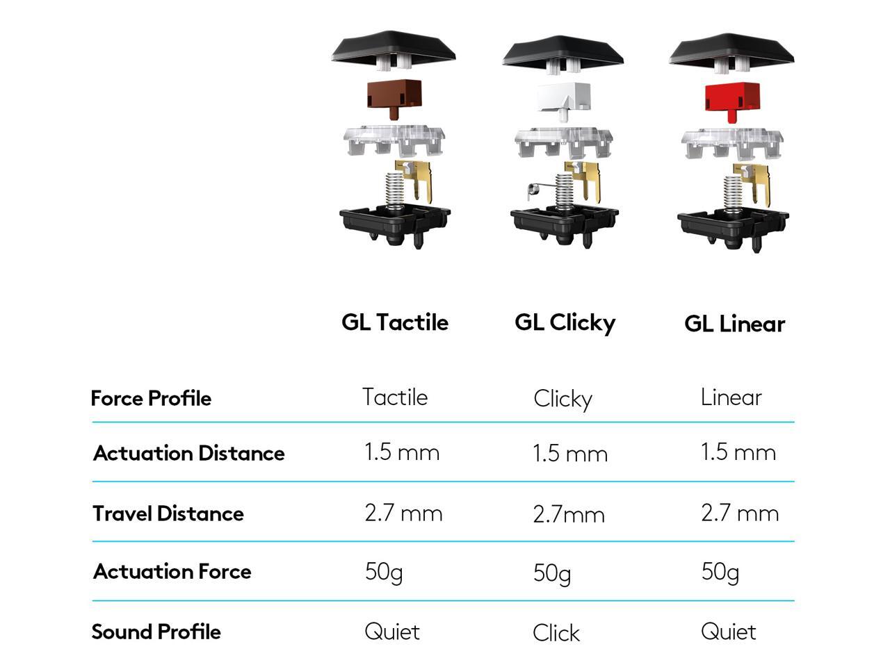 - Low-profile mechanical switches - New high-performance gaming switches offer the speed, accuracy and performance of a mechanical switch at half the height. The GL Linear switch features a completely smooth keystroke through the point of actuation. Comes in three options: GL Tactile, GL Linear or GL Clicky.