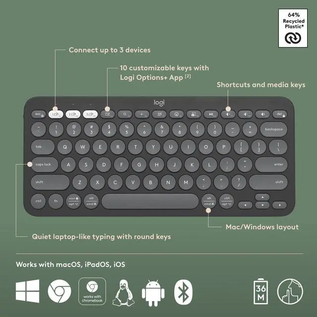 Pebble Keys 2 K380s Bluetooth keyboard gives you hours of use, coming with a 3-year battery and 50% more battery life. *Battery life and wireless range may vary based on user and computing conditions.
