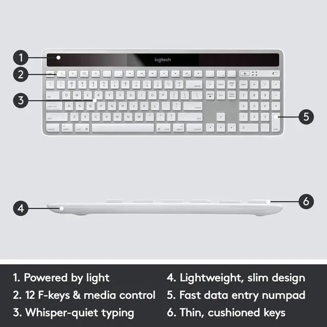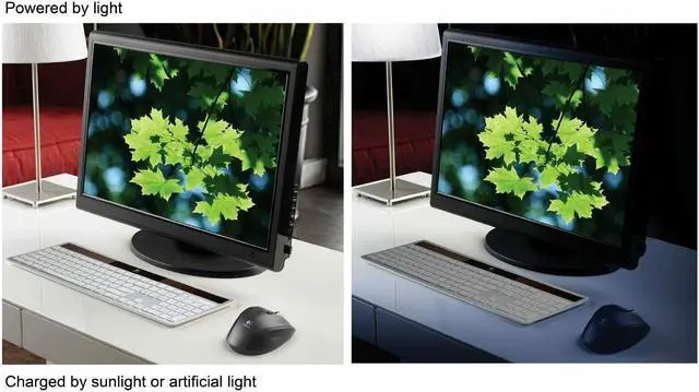 The keyboard charges itself with lamplight or sunlight. Easily monitor your power level with the Logitech Solar App.