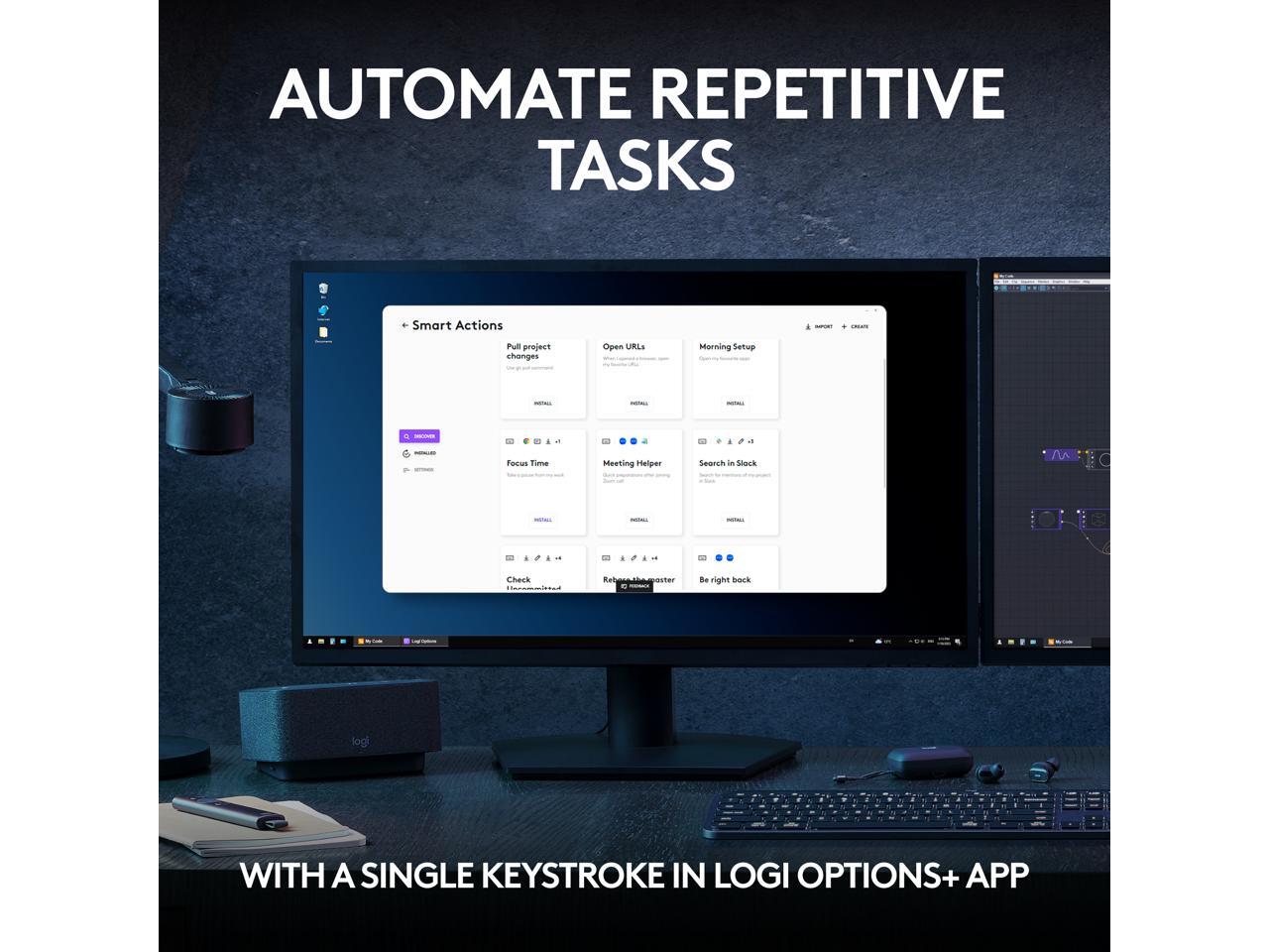 - Automate Repetitive Tasks: Easily create and share time-saving Smart Actions shortcuts that perform multiple actions with a single keystroke with the Logi Options+ app