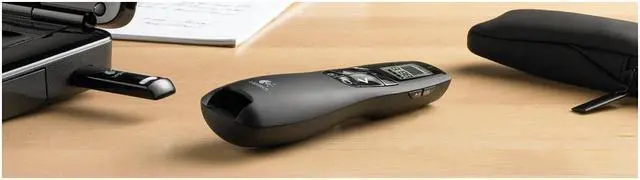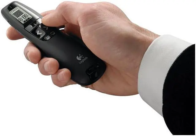 When you're moving around the room to engage your audience, at a range of up to 100 feet (30 meters), a reception - level indicator on the LCD keeps you from wandering too far. The intuitive slideshow controls help you find buttons easily by touch, and the compact design allows you to take it with you wherever you go. Plus the contoured shape feels great in your hand, so you'll be comfortable and confident that your presentations will make a lasting impression with your audience. Grab the Logitech Professional Presenter R800 and grab hold of your audience Your slideshow presentation is ready. The room is full. And with your wireless Logitech Professional R800 Presenter in hand, you're set to grab hold of your audience. Aim the laser pointer at the screen and everyone sees your point. The brilliant green laser light is strong enough to be seen clearly, even across a large conference hall. Move smoothly and confidently from slide to slide with intuitive one-touch controls. Focus on your presentation, instead of the clock, with an easy-to-set timer and vibrating alerts to help you manage your time.