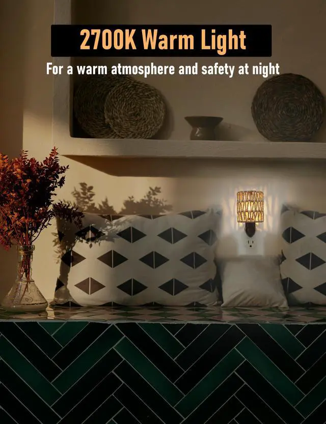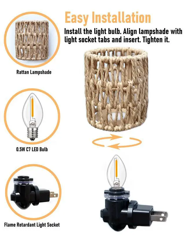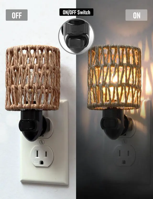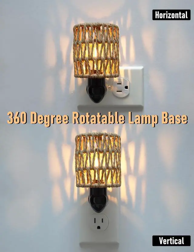 Featuring a bohemian design with a rattan shade and a 0.5W 2700K E12 LED energy saving bulb, this boho plug-in night light provides soft, non-glaring nighttime illumination. It is especially suitable for baby nursery, but also for bedroom, hallway, kids' room, kitchen, bathroom and living room. It has a replaceable lampshade and bulb, making it easy to replace the bulb when it breaks and the lampshade when you want to change the style. The base of the lamp is made of flame retardant plastic, safe and reliable. The clever design keeps the night light from blocking other jacks in the socket. The lamp base can be rotated 360 degrees, you can adjust the angle of the night light according to your needs, either horizontally or vertically in the socket. Manual on off switch, light up only when you need it. Energy-saving and environmentally friendly, ultra-low energy consumption, only 14.6 kWh a year (based on 8 hours of work per day)