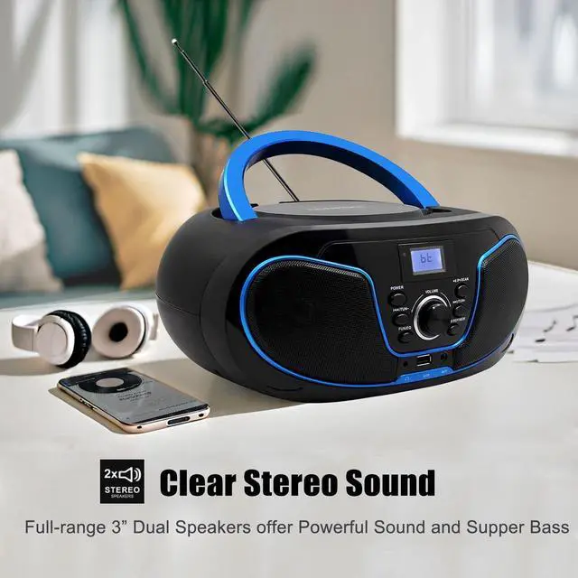 PORTABLE POWERFUL SOUND: 1. High configuration designed; 2. Packed with two powerful audio speakers for deep and dramatic sound; 3. Offering variety of playback choices: USB MP3 playback or Audio CD.