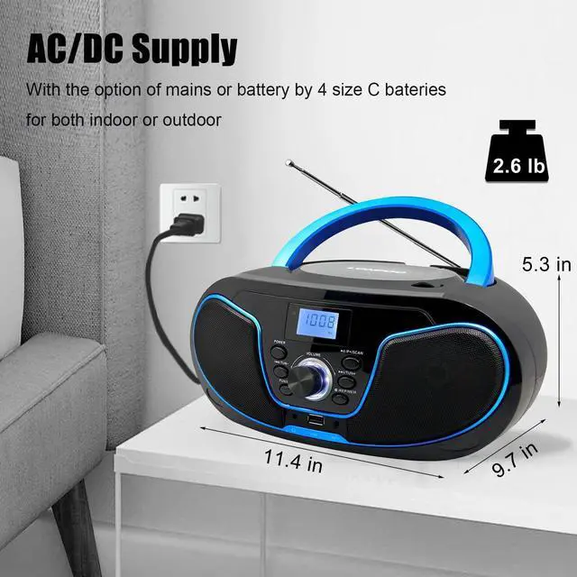 - Can be powered by an AC adapter indoor or 4PCS SIZE C batteries (not included) for outdoor listening on the go.