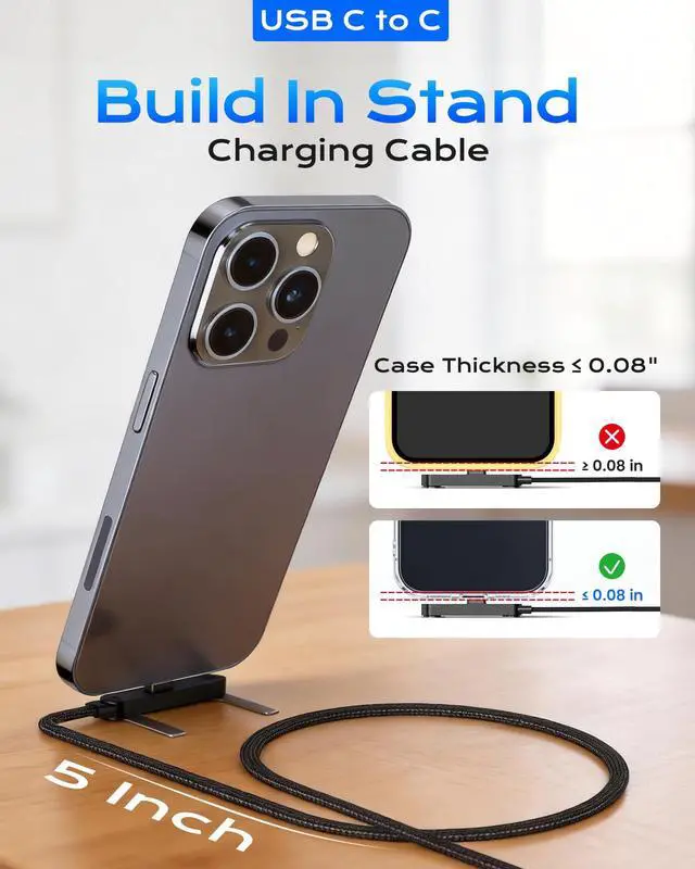 The built-in stand design of this data cable is suitable for most standard phone cases. However, if your phone case is thick (with a thickness exceeding 0.08 inches) or the port opening is small, it may affect the stability of the stand.