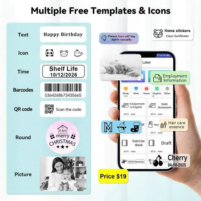 Smart Custom Editing & Multi-Language Support: Design unique labels effortlessly using the free app. This label maker supports 19 languages, 50+ fonts, and 500+ icons perfect for creative designs, sticker printer projects, and print pod users. Make etiquetas personalizadas, logos, symbols, or barcodes everything is possible with this versatile labeler.