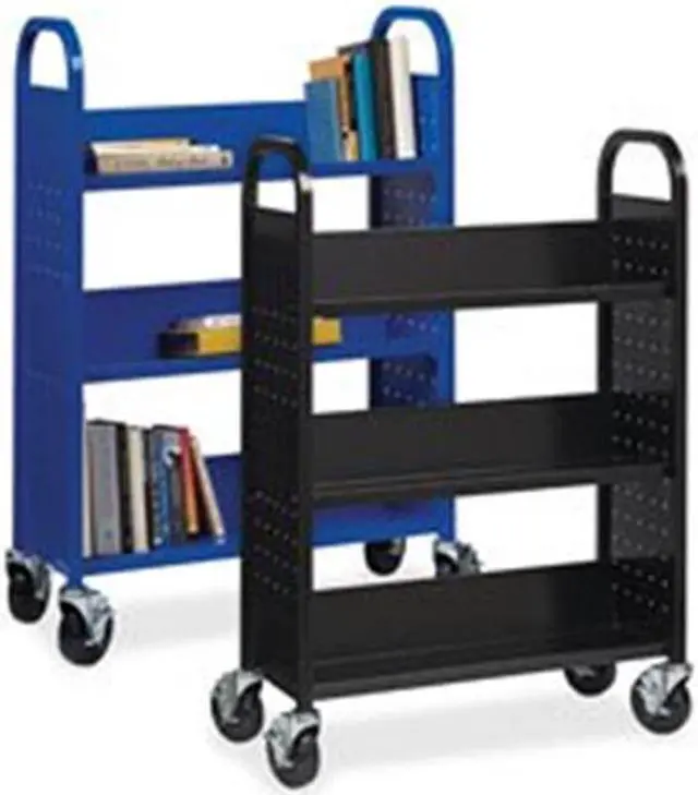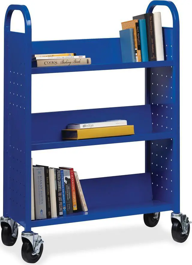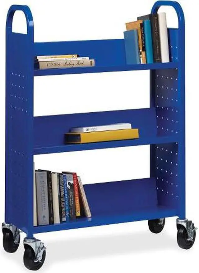 Lorell Single-sided Steel Book Cart - 3 Shelf - Round Handle - 5" Caster Size - Steel - x 32" Width x 14" Depth x 46" Height - Blue - 1 Each Single-sided book cart offers three slanted shelves where you can organize and transport your books and other items. The opening between each shelf measures 12". Sturdy sturdy design features smooth, rounded handles for easy maneuverability and perforated end panels for style and better air circulation. Cart moves easily on 5" casters that all lock for when you need the cart to stay put.