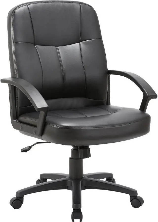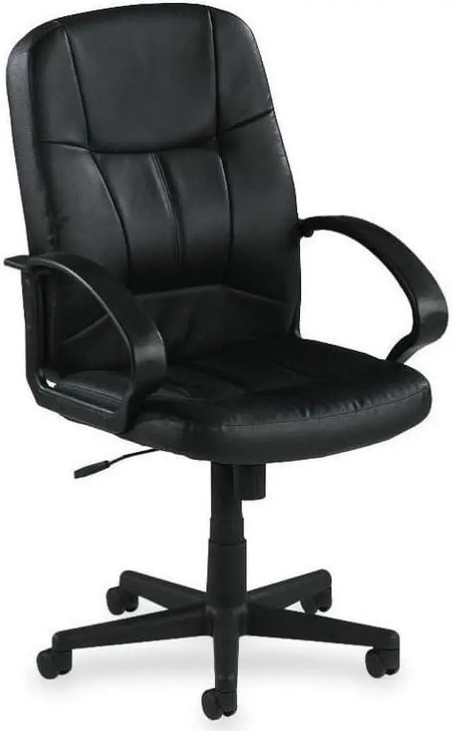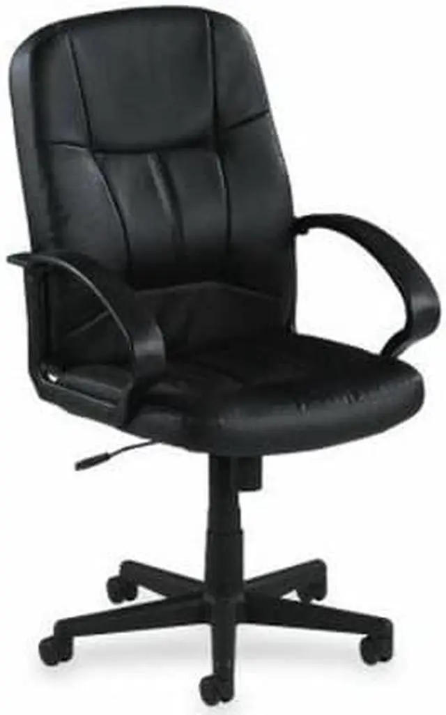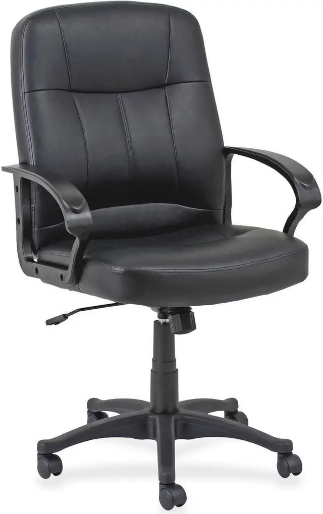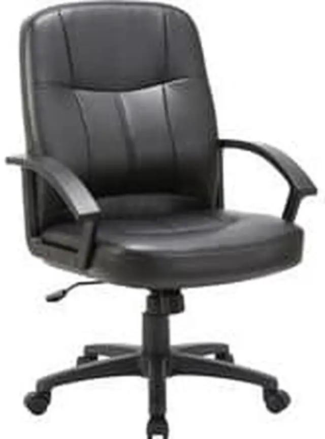Managerial mid-back chair offers a fully upholstered design with black, split leather for a rich classic look. Black frame has stylish open loop arms and five-star nylon base with casters for mobility. Functions include pneumatic seat-H adjustment, 360-degree swivel, tilt, and tilt tension. Seat cushion is 21-1/2"" wide x 19-1/2"" deep. Seat back measures 21"" wide x 25-1/2"" high. Mid-back chair meets the CA117 fire-retardant standard.