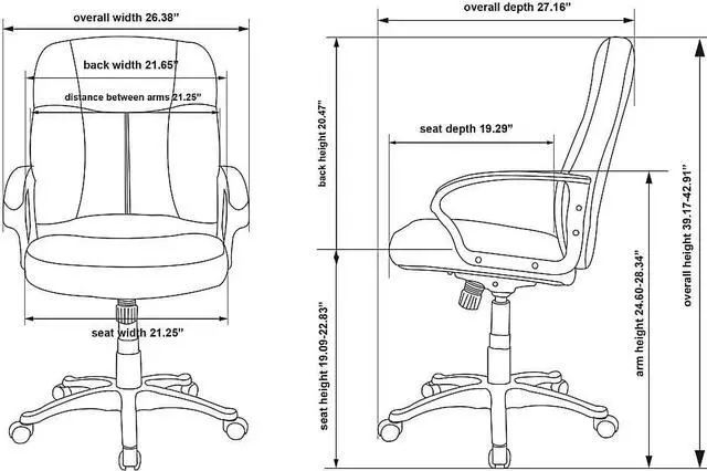 Mid-back chair features pneumatic seat height adjustment, 360-degree swivel, tilt, tilt tension control and an attractive black frame with five star nylon base and casters.