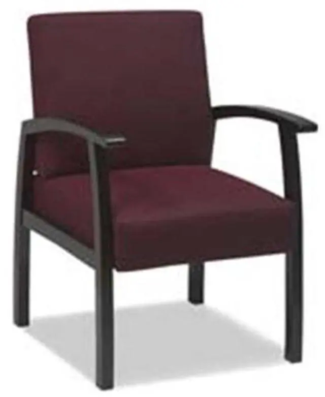 Guest chair offers a thick padded seat and back with built-in lumbar support. Base and arms are made of wood. Easily assemble chair using the chair's unique locking system. Assembly requires no tools.