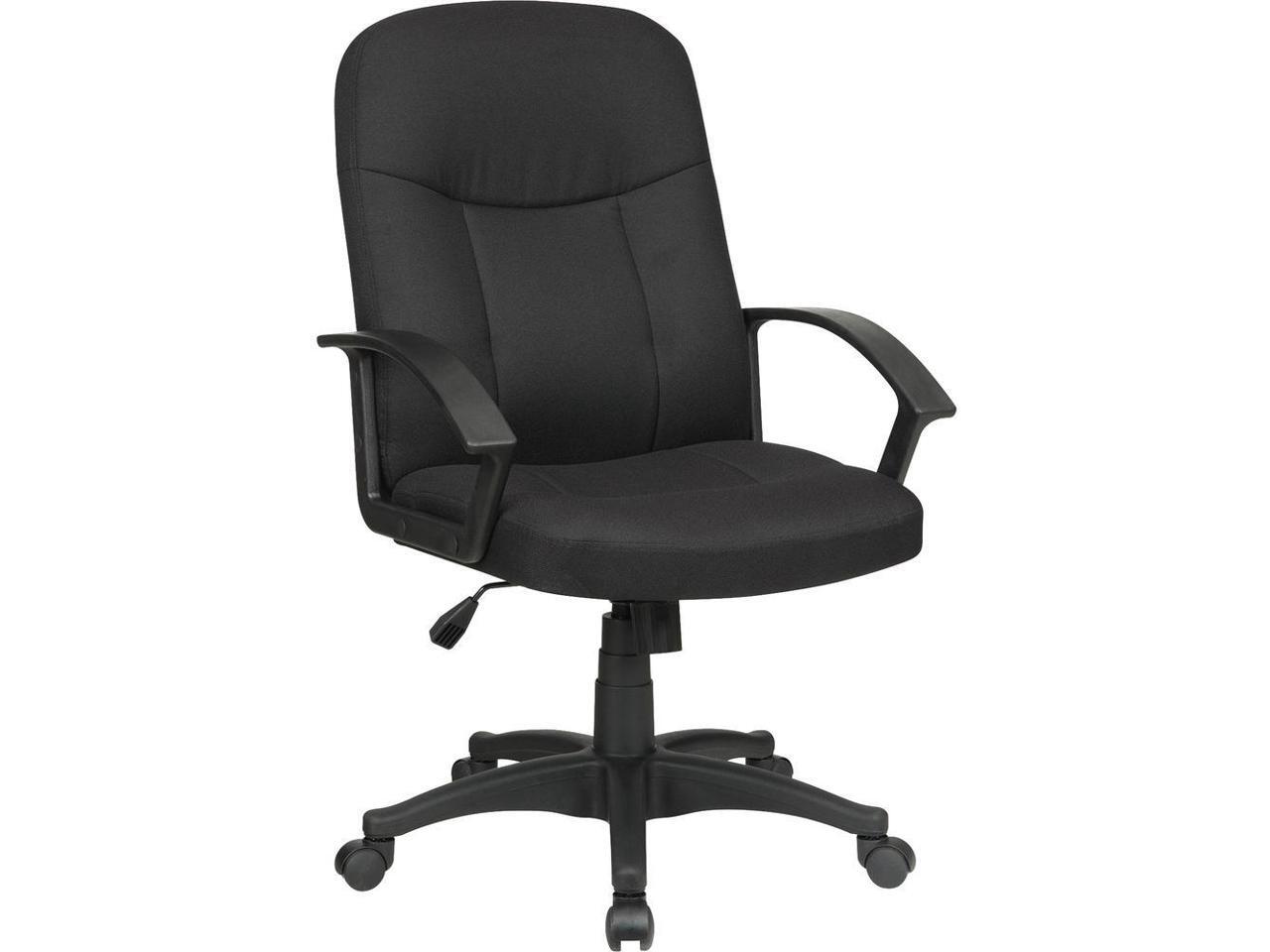Black frame offers stylish, fixed, nylon open-loop arms and a five-star nylon base with dual-wheel hard casters for easy mobility. 3"" thick back cushion for comfortable seating wh...