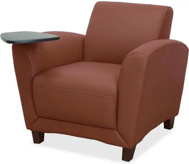 Chair with a convenient writing tablet is part of the Lorell Reception Seating Collection that is made with an open, inviting modern design and bonded black leather. Mounted on the right arm, the tablet swings out for a versatile worksurface. Back meets the seat at a slight obtuse angle for a relaxing wait. Sides rise for armrests. Comfortable, thick foam cushions are CA117 fire-retardant. Four sturdy, wooden legs with a Mahogany finish support the chair. Weight capacity is 250 lb.