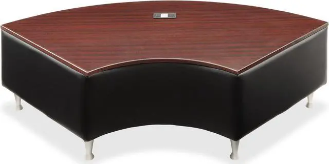 Connector unit offers a durable Mahogany laminate, leather upholstery and ways for guests to easily power their mobile lifestyle with a power outlet, Wi-Fi plug and two USB ports near the center for easy access from all directions. Plug in and keep surfing, playing games, answering urgent emails and more. Four brushed aluminum legs offer reliable support. Design also includes upholstered sides that match the rest of Lorell's Fuze Modular Lounge Series for seamless integration. This connector table unit fits into multiple configurations that are ideal for impromptu collaboration, reception and lounge areas. Other series components (sold separately) include square lounge chairs with power outlets, end lounge chairs (left and right) with power outlets, armless lounge chairs and a bench. Seat is 18" high from floor. Weight capacity is 250 lb.