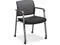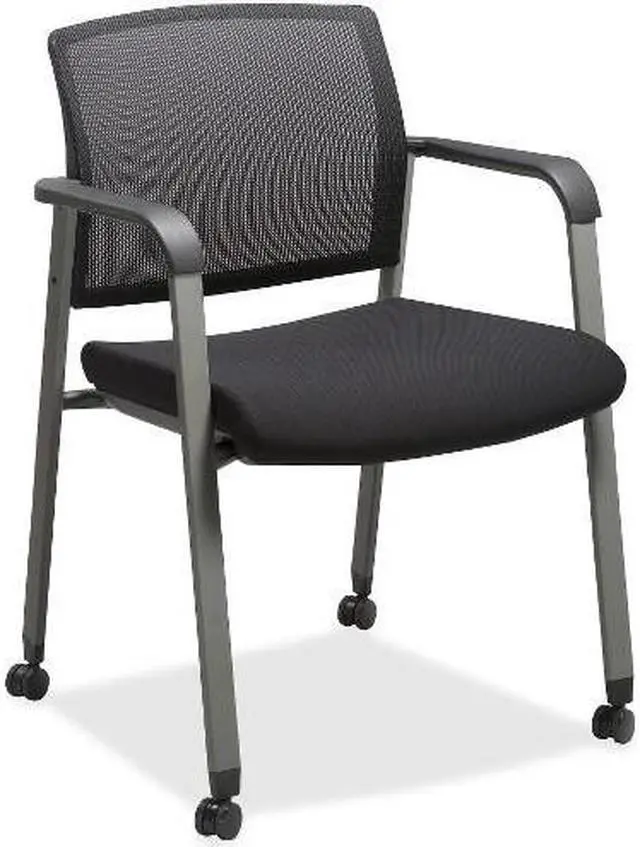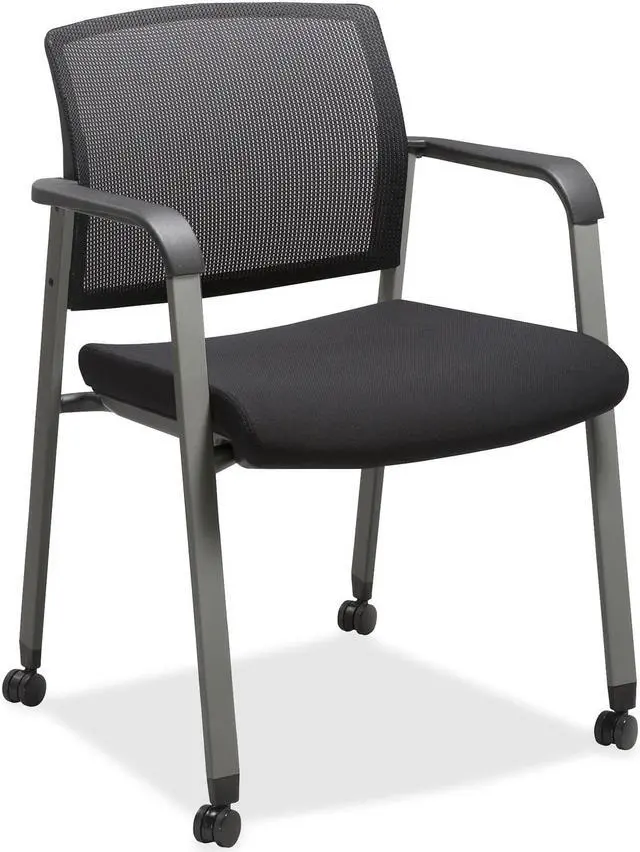 Guest chair with casters features a mesh back to mold to your natural curvature. The exhaust vent in the plastic cover under the fabric-upholstered, cushioned seat offers even more breathability. Nylon pads top the fixed arms that are built into the four square tube legs. Casters allows easy movement and relocation. Use for your lobby or large meeting areas. Stack up to 4 high. Seat measures 18-3/4" wide x 18-3/8" deep x 18-1/8" high. Back size is 17-3/8" wide x 14" high.
